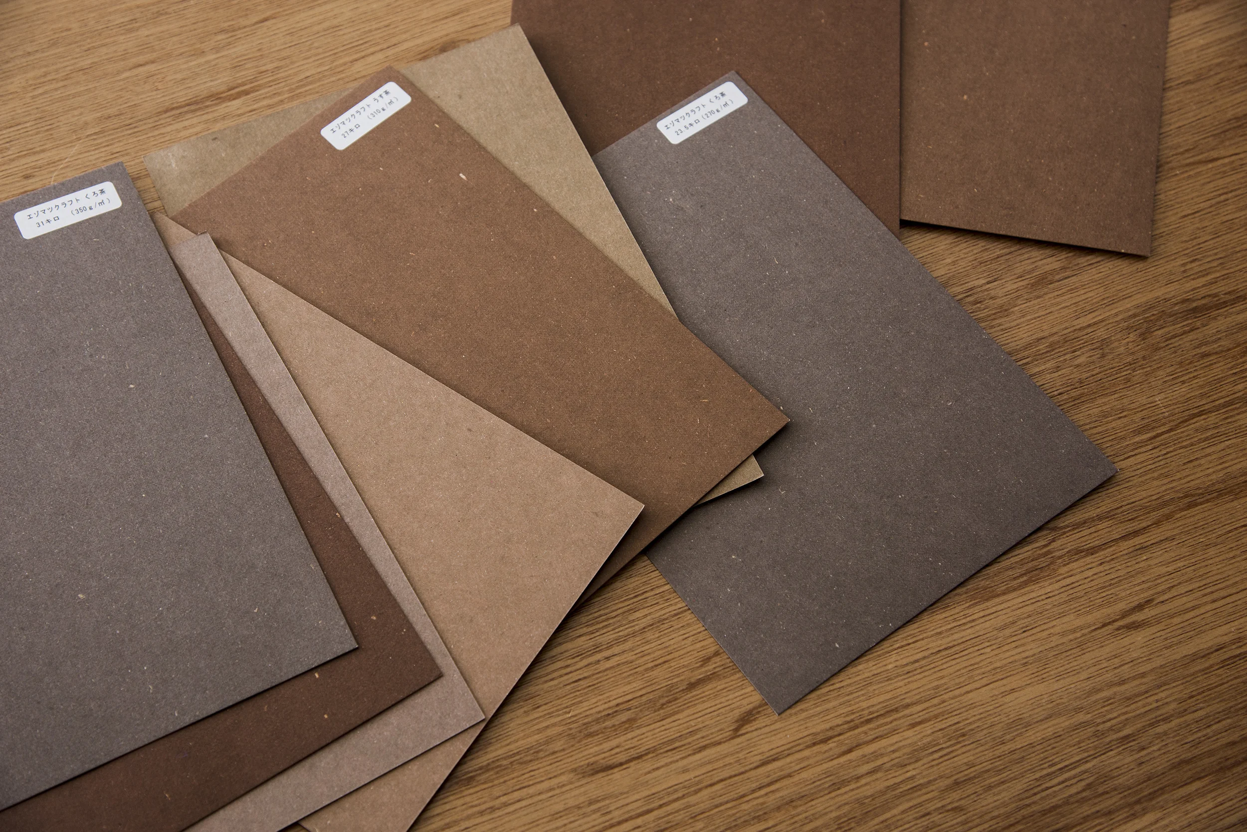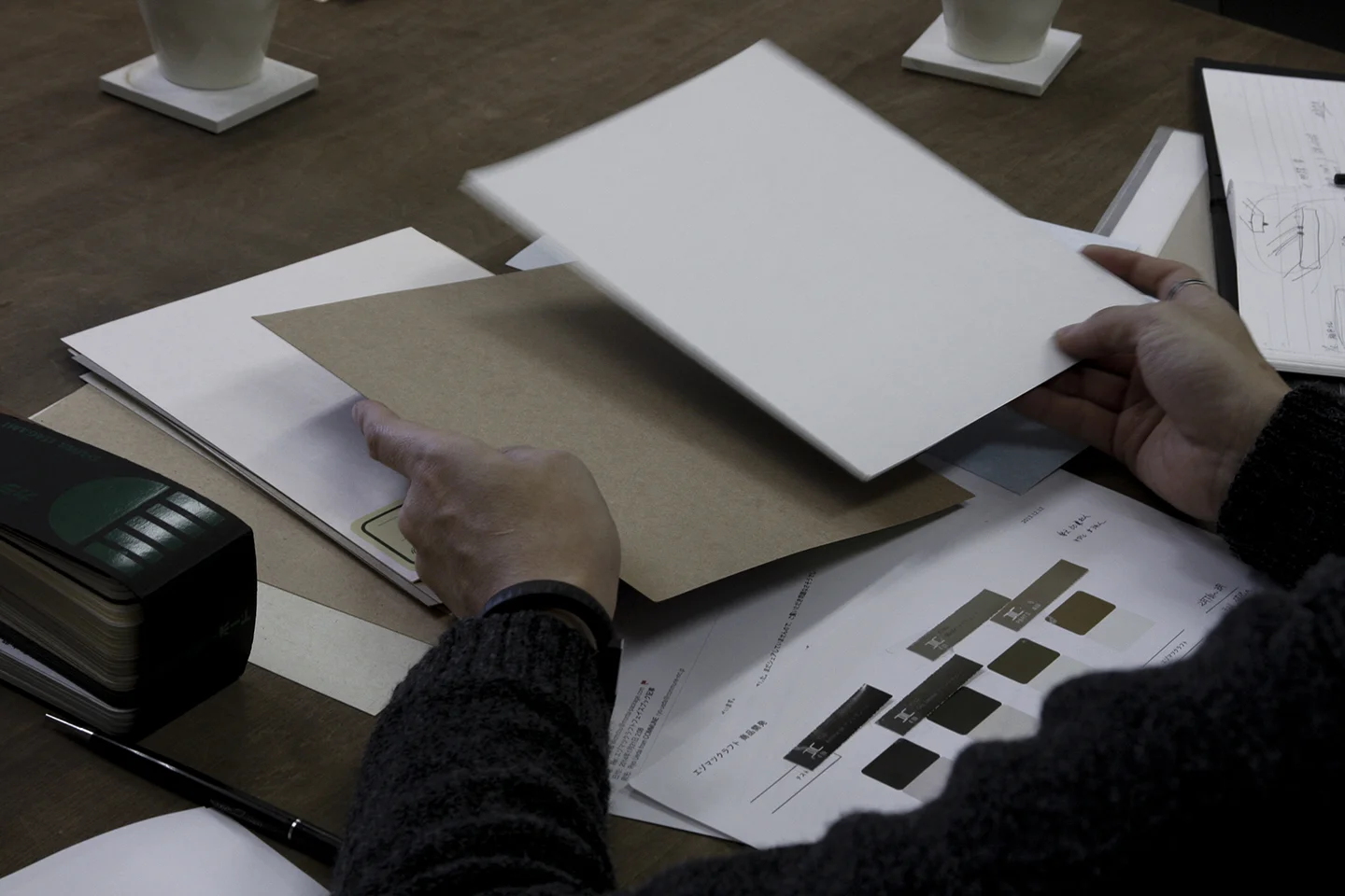 コンセプトに沿ってテスト漉きとチェックを繰り返す。エゾマツの粉末の大きさも、色や質感も、はじめからイメージ通りにはならない。ましてやコンセプトを立てたとはいえ、言葉にしにくい感覚的な部分も大きい。カラーチップや会社にある紙の端切れなどヒントになりそうなものを大和さんに発送する。「もう少し色味を近づける」「工程で現れる金属の網目が紙の表面に出るのをもう緩和できないか」「印刷適性のために表面に施された塗工をなくせないか」など細かな指示した。が、どうしても無理なこともある。何度もテストとチェックのやり取りを繰り返し、ようやく理想の「エゾマツクラフト」に近づいてきた。テスト漉きといっても、一枚の紙を手漉きするような単純なことではなく、工場のラインが動いて、大量のエネルギーや原材料を消費し、一度に何枚もの紙がつくられてしまう。テストにはコストが多分にかかる。何度も何度もお願いすることはできない。