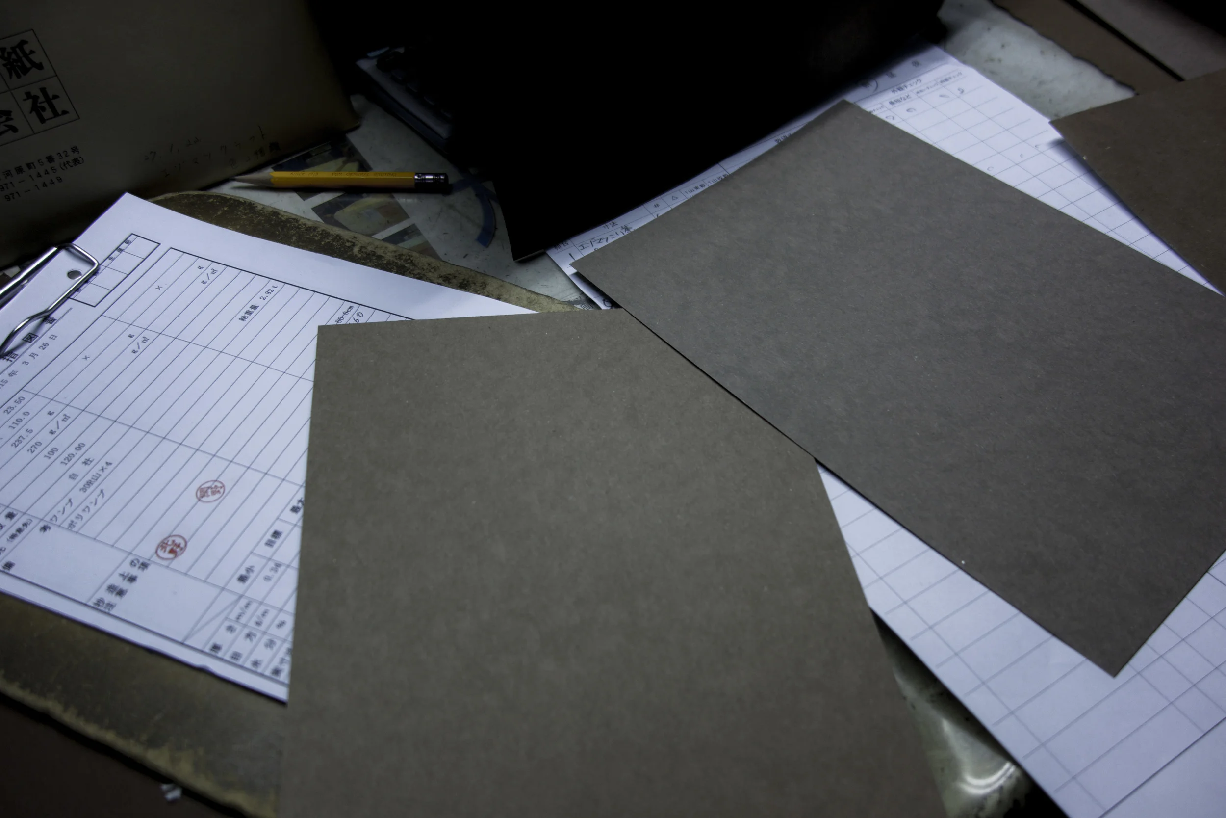 最後(になるであろう)テスト漉きサンプルを持って大和さんが札幌に。理想の「エゾマツクラフト」の色味がほぼ再現されていた。エゾマツの粉末が散りばめられた質感も、三色そろえた深い茶色も、表裏のバランスもほぼ理想に近い。これまでのやりとりは大阪と札幌の距離を隔てたキャッチボール。やりとりにタイムラグとズレが生じる。最後に少しでも理想に近づけるために、大阪の工場を直接訪れることになった。意見を投げるラストチャンス。