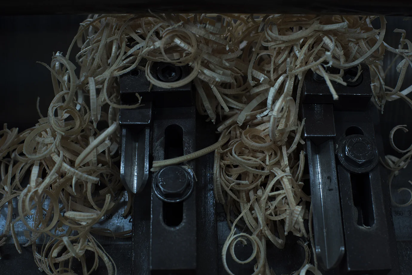 エゾマツ粉末のサンプルが上がってきた。言うなればただの木の破片。大和さんが試験的に漉いたサンプルを見て、粉末の量や細かさなど意見を出し合う。ベージュや白系の紙はよくある和紙のようで、まだ使用するイメージがわかない。木の印象を活かすために僕はこの時点で「紙は木の色(茶色)にしよう」と決断した。また「8層を重ねてつくる板紙の構造」や「染料」についてなど技術的な話を聞くこともできた。「8層の内うち最前面の層を薄く重ねて下の層の色を出すことで違う色になる」というリバーシブルの紙の構想もこのタイミングで思いついたものだ。