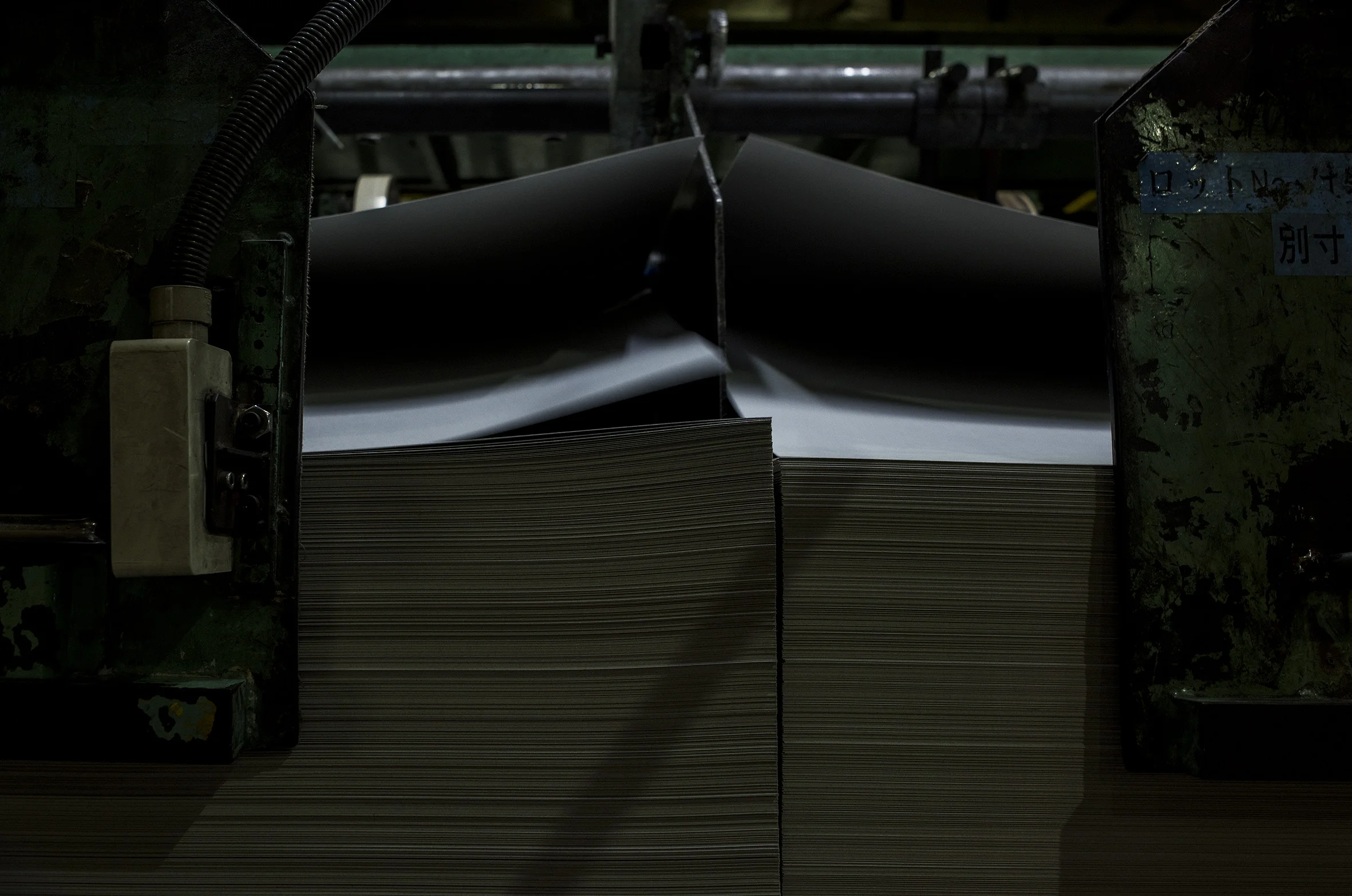 近藤さんと二人で大阪へ。工場にとってはゴーサインをもらうための最後の仕事だ。この時点で調整できることは限られている。工場をくまなく案内していただき、製紙業の大変さと壮大さに感動する。工程の最後に板紙の形になってできあがってくる「エゾマツクラフト」をその場でチェック。「理想に近いけどもう少しだけ!」と色について泣きのお願いをさせてもらう。職人さんたちは色を計測する機械で微調整してくれた。工場とはデザイナーにとって気持ちのいい場所だと思う。プライドを持った職人が技術を発揮する場所。同じ目標に向かって労を尽くす仲間でもある。だから僕は熱量を持って希望を伝える。むずかしい理由はあれど職人さんが「できない」とは言うことはない。必ず応えようとしてくれる。最後に機械から吐き出された板紙は、3年かけてみんなでつくった理想の「エゾマツクラフト」だった。